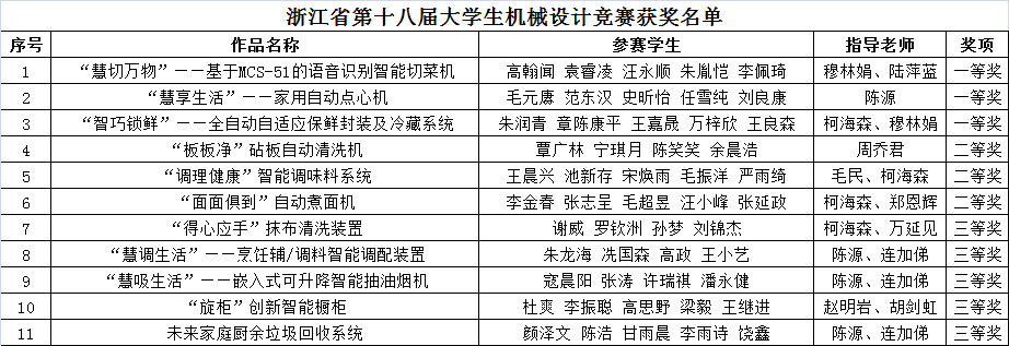 近日,以“幸福健康廚房、智慧樂享生活”為主題的浙江省第十八屆大學生機械設計競賽決賽結果公布,經過激烈角逐,我校最終獲得省一等獎3項、二等獎3項、三等獎5項的好成績。