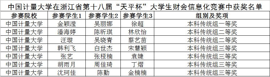 由浙江省大學(xué)生科技競賽委員會(huì)主辦,浙江財(cái)經(jīng)大學(xué)承辦,浙江工商大學(xué)、浙江天平審計(jì)集團(tuán)有限公司協(xié)辦的浙江省第十八屆“天平杯”大學(xué)生財(cái)會(huì)信息化競賽日前落下帷幕,本次競賽規(guī)模大、覆蓋面廣,吸引了來自全國各地共68所學(xué)校、685支隊(duì)伍、2055名學(xué)生參加,經(jīng)過初賽篩選、決賽答辯,我校學(xué)生共獲省一等獎(jiǎng)1項(xiàng),省二等獎(jiǎng)2項(xiàng),省三等獎(jiǎng)4項(xiàng)。