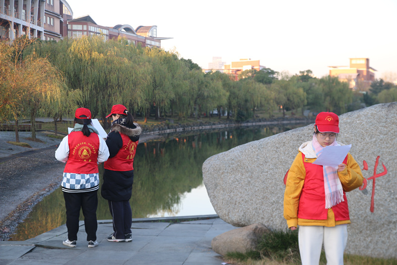 12月2日、3日早上6點30分至7點30分,法學院的志愿者們在日月湖邊開展憲法晨讀活動。旭日初升,正如學生的精神狀態飽滿激昂;寒風凜冽,吹不散對憲法的敬畏與尊崇;波光瀲滟,恰似憲法在學生心中激起層層波瀾。通過這種具有儀式感的憲法晨讀活動,讓憲法內容與精神深入人心,同時也讓路過的師生了解憲法,號召更多的人加入到晨讀的隊伍中。