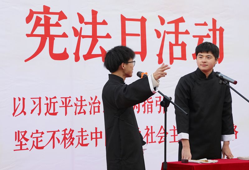 憲法是國家的根本大法,是治國安邦的總章程。2021年12月4日是第八個國家憲法日,我校學生緊跟時代步伐,12月4日前后組織開展以“以習近平法治思想為引領,深入學習宣傳憲法”為主題的國家憲法日系列活動。不僅面向校園,更深入社區,開展形式多樣、內容豐富、內涵深刻的憲法宣傳普及工作。以期提高憲法認識,增強守憲意識,傳播憲法精神,推進我校與社區法治建設,讓憲法精神深入人心。