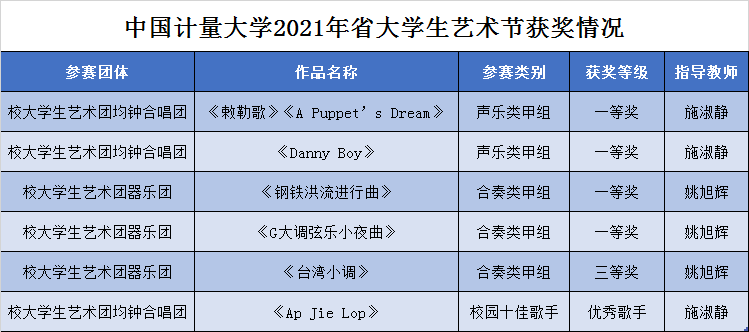 10月26日-11月4日,由省教育廳、省文化和旅游廳、團省委共同主辦的2021年浙江省大學生藝術節決賽在浙江機電職業技術學院和臺州學院隆重舉辦,我校榮獲一等獎4項、三等獎1項、優秀歌手獎1項,姚旭輝、施淑靜老師榮獲優秀指導教師獎,學校獲優秀組織獎,其中校大學生藝術團均鐘合唱團聲樂作品《敕勒歌》《A Puppet’s Dream》排名聲樂甲組第三名。