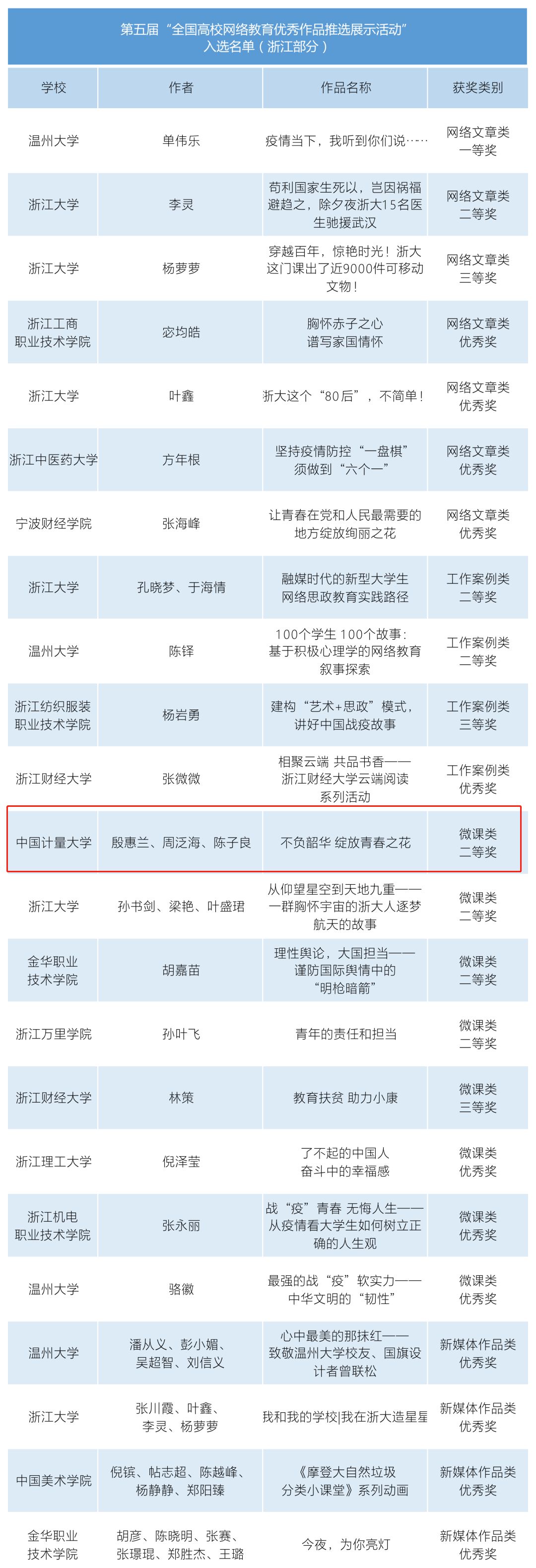 近日,由教育部思想政治工作司、中央網信辦網絡社會工作局聯合主辦的第五屆“全國大學生網絡文化節”和“全國高校網絡教育優秀作品推選展示活動”遴選結果公布,我校教師殷惠蘭、周泛海、陳子良創作的微課作品《不負韶華 綻放青春之花》榮獲第五屆全國高校網絡教育優秀作品推選展示活動二等獎。