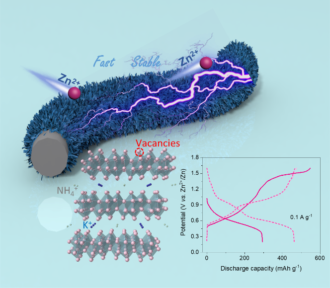 近日,材化學院王疆瑛教授團隊在水系鋅離子電池正極材料取得重要進展,相關成果以“Potassium Ammonium Vanadate with Rich Oxygen Vacancies for Fast and Highly Stable Zn-Ion Storage”為題發表在國際著名期刊ACS Nano(IF=15. 881)上。材化學院青年教師宗泉為文章的第一作者,中國計量大學為第一通訊單位。