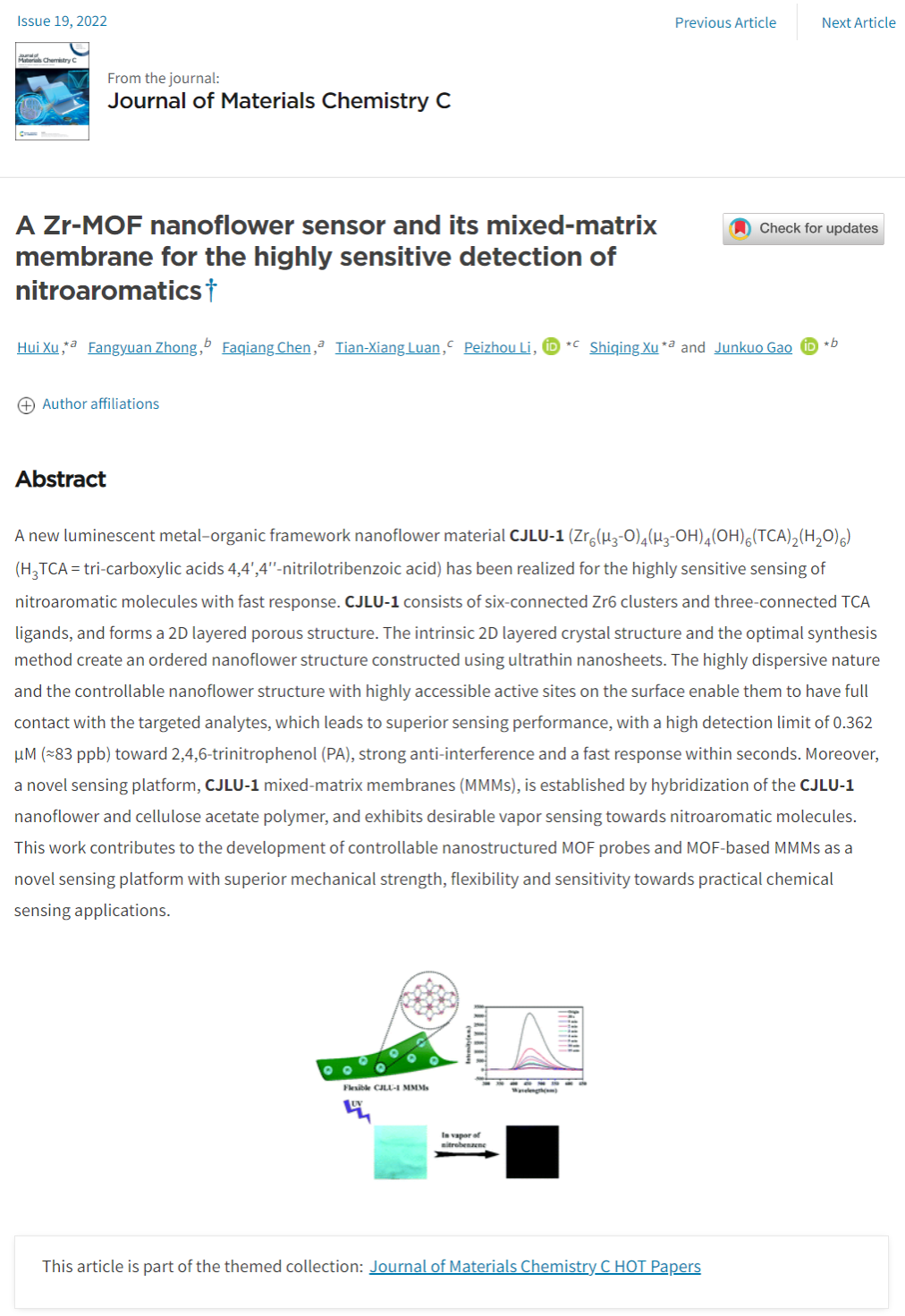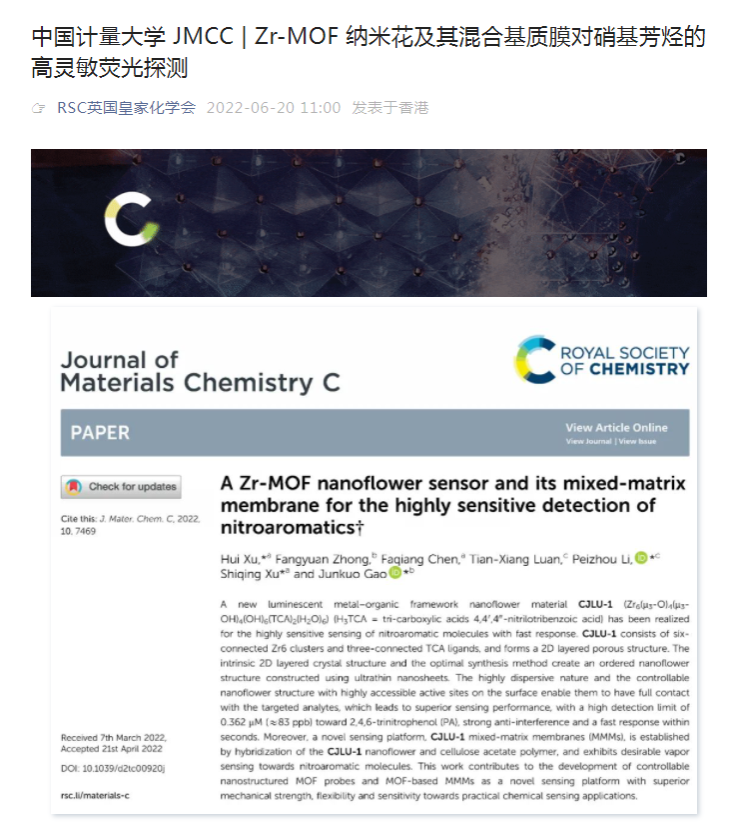 近日,我校光電學院徐時清團隊在多孔MOFs材料混合基質膜做環境污染物硝基芳烴的高效熒光傳感研究方面取得重要進展,相關成果以“A Zr-MOF nanoflower sensor and its mixed-matrix membrane for the highly sensitive detection of nitroaromatics ”為題發表在國際著名期刊J. Mater. Chem. C上(IF=7.393),并入選為期刊熱點文章(HOT Papers)。光電學院青年教師徐繪為文章的第一作者,中國計量大學為第一通訊單位。同時,該工作被RSC 英國皇家化學會官方公眾號以《中國計量大學 JMCC | Zr-MOF 納米花及其混合基質膜對硝基芳烴的高靈敏熒光探測》為題進行報道(https://mp.weixin.qq.com/s/rqUERiHvd2WPJBKvuaIzyg)。