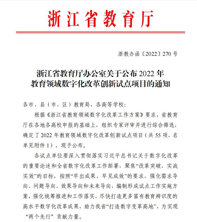 近日,浙江省教育廳下發了2022年教育領域數字化改革創新試點項目名單,我校申報的《基于招標采購全流程可追溯的多跨場景智慧采購系統》獲批立項。