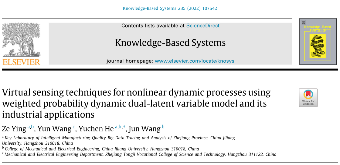 近日,中國計量大學(xué)機電工程學(xué)院何雨辰副教授團隊題為“Virtual sensing techniques for nonlinear dynamic processes using weighted probability dynamic dual-latent variable model and its industrial applications”(基于質(zhì)量相關(guān)加權(quán)概率動態(tài)隱變量結(jié)構(gòu)的非線性動態(tài)工業(yè)過程軟測量方法及其實例應(yīng)用)的研究論文在人工智能頂級期刊Knowledge-Based Systems在線發(fā)表。通訊作者為何雨辰副教授,第一作者為本校研究生應(yīng)澤。