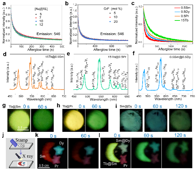 該論文創新性地通過在NaLuF4基質晶格中引入Na+間隙,大幅增強了稀土激活離子(Tb,Dy,Pr和Sm)的余輝發光,結合光譜分析與第一性原理計算,提出了Na+間隙促進陰離子弗蘭克缺陷的形成機制;采用核殼結構空間分離不同類型的稀土激活離子,實現了無外場刺激條件下依賴于時間維度的多種余輝顏色演變體系(圖1);設計了能夠同時產生上轉換、下轉移與余輝發光的三層核殼納米晶,闡明了共摻稀土激活離子抑制余輝發光的機制,實現了不同激發波長條件下依賴于時間維度的余輝顏色演變。研究結果為實現依賴于時間維度的顏色演變體系提供了寶貴的普適性策略。