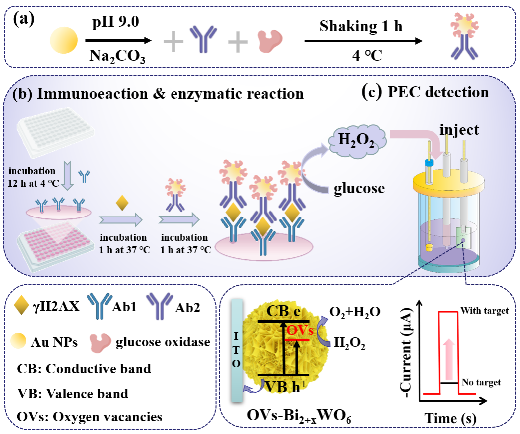 本工作開發了一種具有雙信號放大的新型陰極光電化學(PEC)免疫分析法,用于快速和超靈敏地檢測細胞裂解液中的γH2AX,最終實現基因毒性化合物的快速篩查和毒性評估。利用二抗/金納米顆粒/葡萄糖氧化酶共軛偶聯物作為標記檢測抗體,首先在96孔板上進行了針對γH2AX的夾心免疫反應。共軛物的引入提高了葡萄糖氧化酶對葡萄糖的催化性能,進而增加了H2O2的產生,提供了信號放大的第一個機制;接著,將含有H2O2的免疫反應產物注入電解池中,進行光電化學反應。H2O2作為電子受體,可在富含氧空位的Bi2+xWO6光電陰極上發生光還原反應, 放大光電流,此外,氧空位既是H2O2的吸附位點,又是H2O2的活化位點,從而進一步增強了光電流,為信號放大提供了另一種機制。 基于此,建立了γH2AX的超靈敏檢測平臺,線性范圍為0.01-500 ng/mL,檢出限為6.87 pg/mL (S/N=3),比現有傳感檢測方法的靈敏度提高了30倍。通過檢測暴露于已知基因毒性化學物質的細胞裂解液中的γH2AX,驗證了該測定方法的實用性。本工作為基因毒性化學品的篩查提供了一個快速、可靠的工具,并為環境風險評估開辟了一條新的道路。