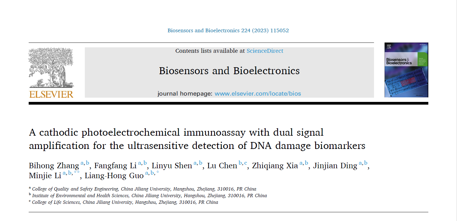 近日,我校質量與安全工程學院郭良宏團隊在國際知名學術期刊Biosensors and Bioelectronics上發表題為“A Cathodic Photoelectrochemical Immunoassay with Dual Signal Amplification for the Ultrasensitive Detection of DNA Damage Biomarkers”的論文,報道團隊開發的DNA損傷標志物高靈敏度光電化學傳感檢測方法。論文第一作者為我校質量與安全工程學院青年教師張碧紅博士,通訊作者為李敏杰副教授、郭良宏研究員。