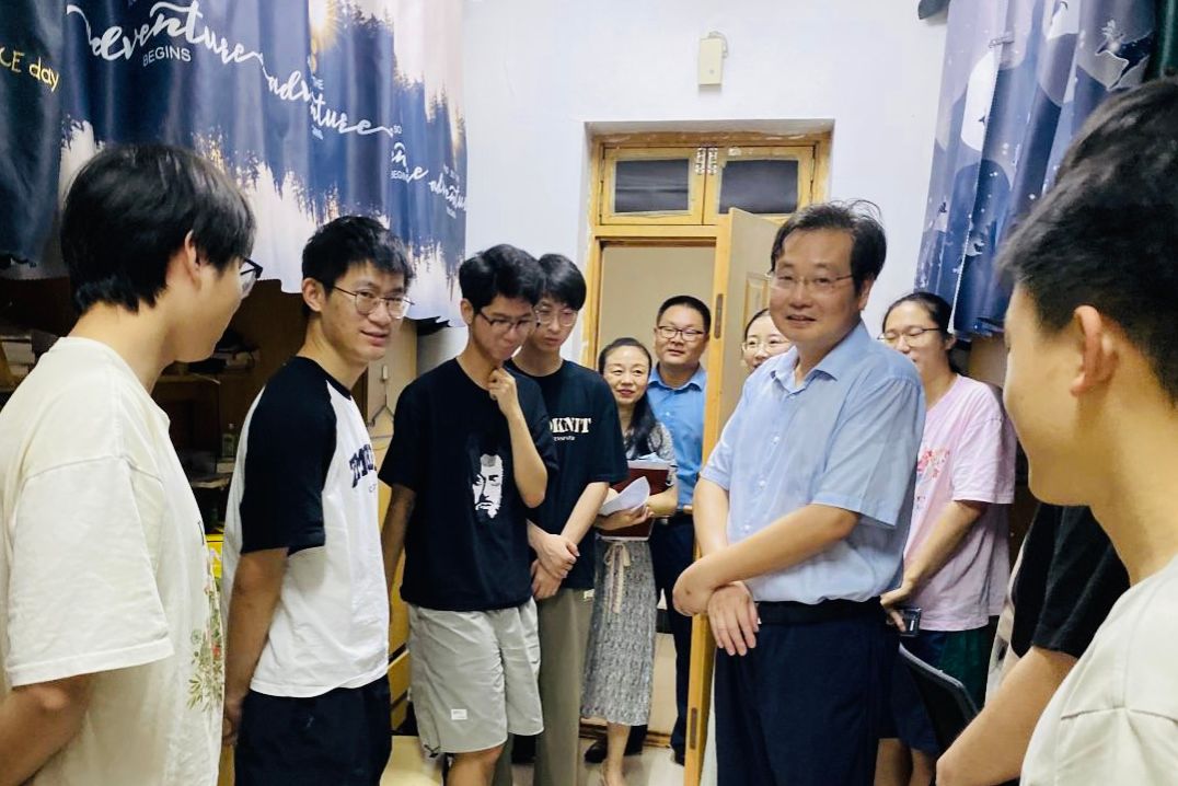 校領(lǐng)導(dǎo)一行還走訪了校航模競(jìng)賽集訓(xùn)現(xiàn)場(chǎng)、生活區(qū)學(xué)生公寓。程剛向暑期留校學(xué)生表達(dá)了慰問(wèn),詳細(xì)了解學(xué)生在學(xué)科競(jìng)賽、考研備戰(zhàn)及校園生活等方面的情況,囑咐同學(xué)們遵守學(xué)校暑期各項(xiàng)管理規(guī)定,預(yù)祝同學(xué)們?cè)诖筚愔腥〉煤贸煽?jī)。