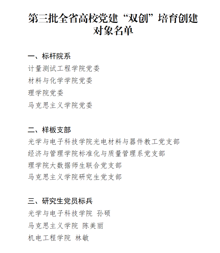 根據(jù)《中共浙江省委教育工作委員會辦公室關于開展第三批全省高校黨建“雙創(chuàng)”培育創(chuàng)建工作的通知》,經學校申報、綜合遴選、省教育廳黨組會審議和公示等程序,確定10個高校黨委、150個院系黨組織、151個基層黨支部、50名研究生黨員為第三批全省高校黨建“雙創(chuàng)”培育創(chuàng)建對象。我校計量測試工程學院黨委、材料與化學學院黨委、理學院黨委、馬克思主義學院黨委4個院系黨委入選全省高校黨建工作標桿院系,光學與電子科技學院光電材料與器件教工黨支部、經濟與管理學院標準化與質量管理系黨支部、理學院大數(shù)據(jù)師生聯(lián)合黨支部、馬克思主義學院研究生黨支部入選全省高校黨建工作樣板支部,機電工程學院林敏、光學與電子科技學院孫碩、馬克思主義學院陳美麗入選全省研究生黨員標兵榮譽稱號。學校本次共申報了11項,全部獲得立項。