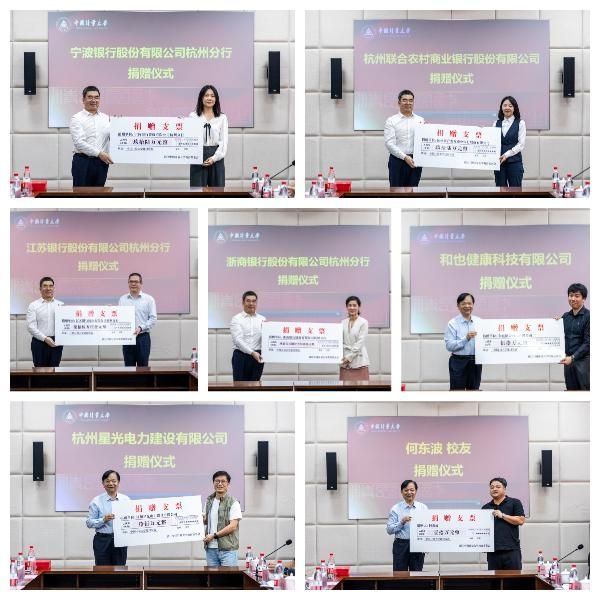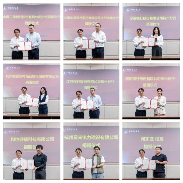 儀式上,中國工商銀行股份有限公司杭州高新支行,中國農業銀行股份有限公司杭州錢塘支行,寧波銀行股份有限公司杭州分行,杭州聯合農村商業銀行股份有限公司,江蘇銀行股份有限公司杭州分行,浙商銀行股份有限公司杭州分行,和也健康科技有限公司,杭州星光電力建設有限公司,2008屆工商管理專業校友何東波等單位和個人向學校慷慨捐贈善款共計1084.33萬元(含信息化建設項目),支持學校信息化建設、科學研究和人才培養。徐江榮向捐贈單位和個人頒發捐贈證書,葛洪良、馮時林代表學校接受捐贈。