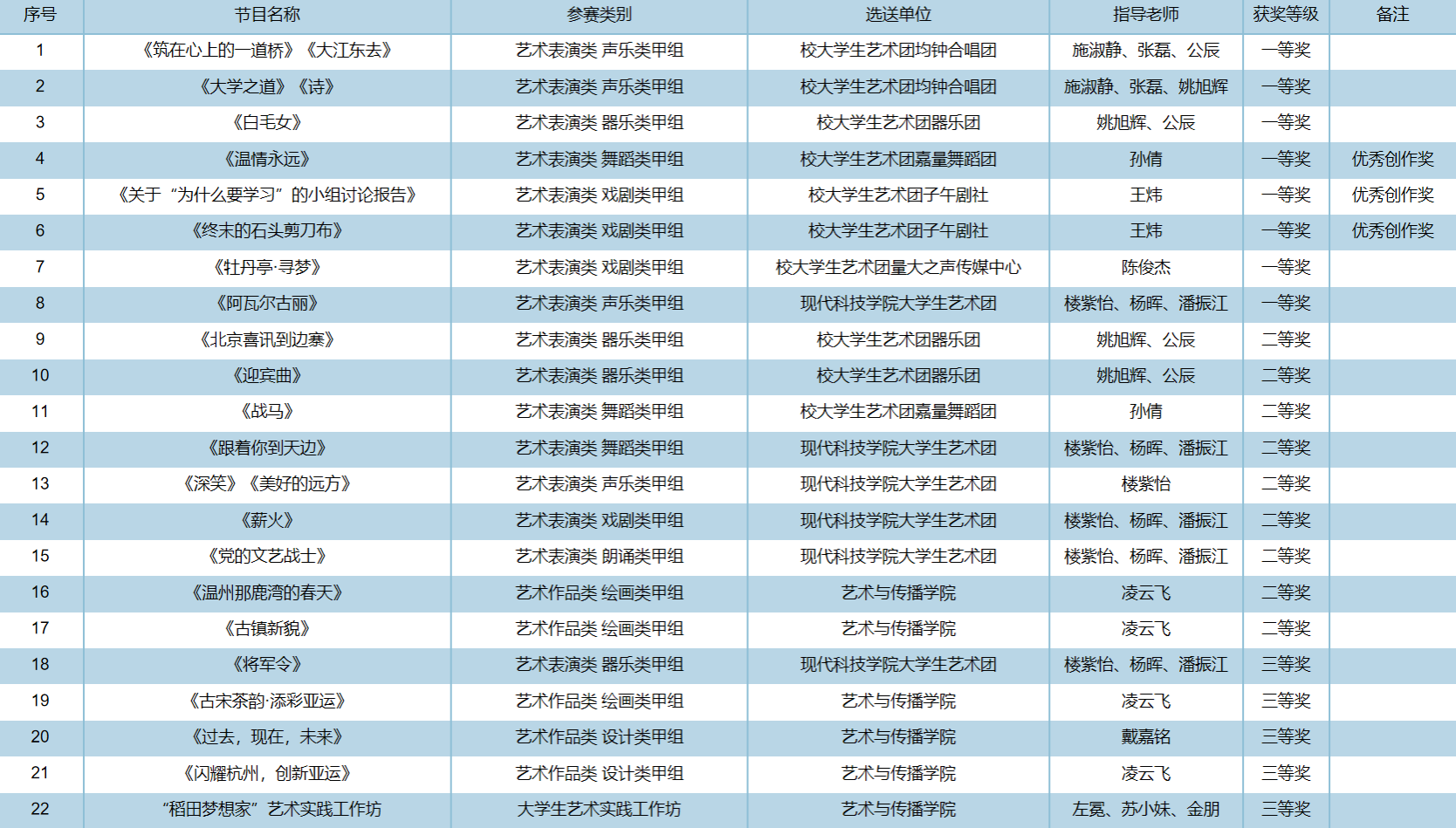 本屆省大學生藝術節(jié)活動分為藝術表演類、藝術作品類、大學生藝術實踐工作坊、高校美育改革創(chuàng)新優(yōu)秀案例四大類,我校共選送27件作品參加藝術表演類和藝術作品類比賽,1件作品參加大學生藝術實踐工作坊比賽,最終斬獲一等獎8項,它們分別是:由施淑靜老師指導、校大學生藝術團均鐘合唱團選送的聲樂作品《大學之道》《詩》和《筑在心上的一道橋》《大江東去》,由姚旭輝、公辰老師指導、校大學生藝術團器樂團選送的器樂作品《白毛女》,由孫倩老師指導、校大學生藝術團嘉量舞蹈團選送的舞蹈作品《溫情永遠》,由王煒老師指導、校大學生藝術團子午劇社選送的戲劇作品《關于“為什么要學習”的小組討論報告》和《終末的石頭剪刀布》,由陳俊杰老師指導、校大學生藝術團量大之聲傳媒中心選送的戲劇作品《牡丹亭·尋夢》,由樓紫怡、楊暉、潘振江老師指導、現(xiàn)代科技學院大學生藝術團選送的聲樂作品《阿瓦爾古麗》。其中,以上所有一等獎作品指導教師均獲評優(yōu)秀指導教師稱號,原創(chuàng)舞蹈作品《溫情永遠》、原創(chuàng)戲劇作品《關于“為什么要學習”的小組討論報告》和《終末的石頭剪刀布》均獲優(yōu)秀創(chuàng)作獎。