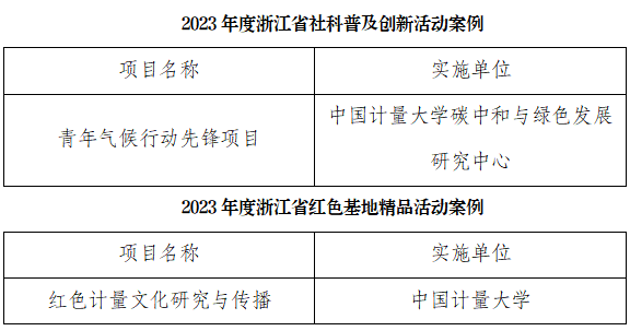 近日,浙江省社科聯發文公布了2023年度浙江省社科普及“創新項目、紅色基地精品項目”案例名單。經學校遴選推薦,社科聯組織專家評審并經黨組會議審定,中國計量大學碳中和與綠色發展研究中心的“青年氣候行動先鋒項目”成功入選社科普及創新活動案例,“紅色計量文化研究與傳播 ”項目成功入選社科普及紅色基地精品活動案例。