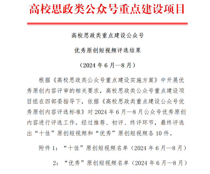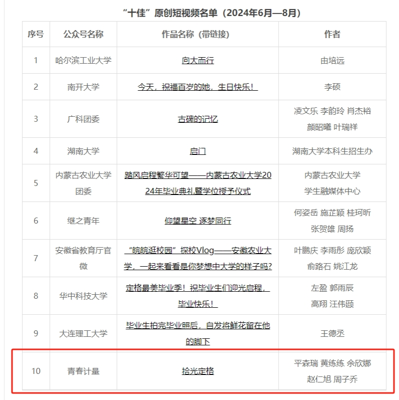 近日,高校思政類公眾號重點建設項目組在四部委指導下,依據《高校思政類重點建設公眾號優秀原創內容評選標準》,開展2024年6月-8月公眾號優秀原創內容評選工作。經專家初評、終評等環節,高校思政類公眾號重點建設項目組評選出“十佳”原創短視頻和“優秀”原創短視頻各10件。我校團委出品的原創短片《拾光定格》入選全國高校思政類重點建設公眾號“十佳”原創短視頻。