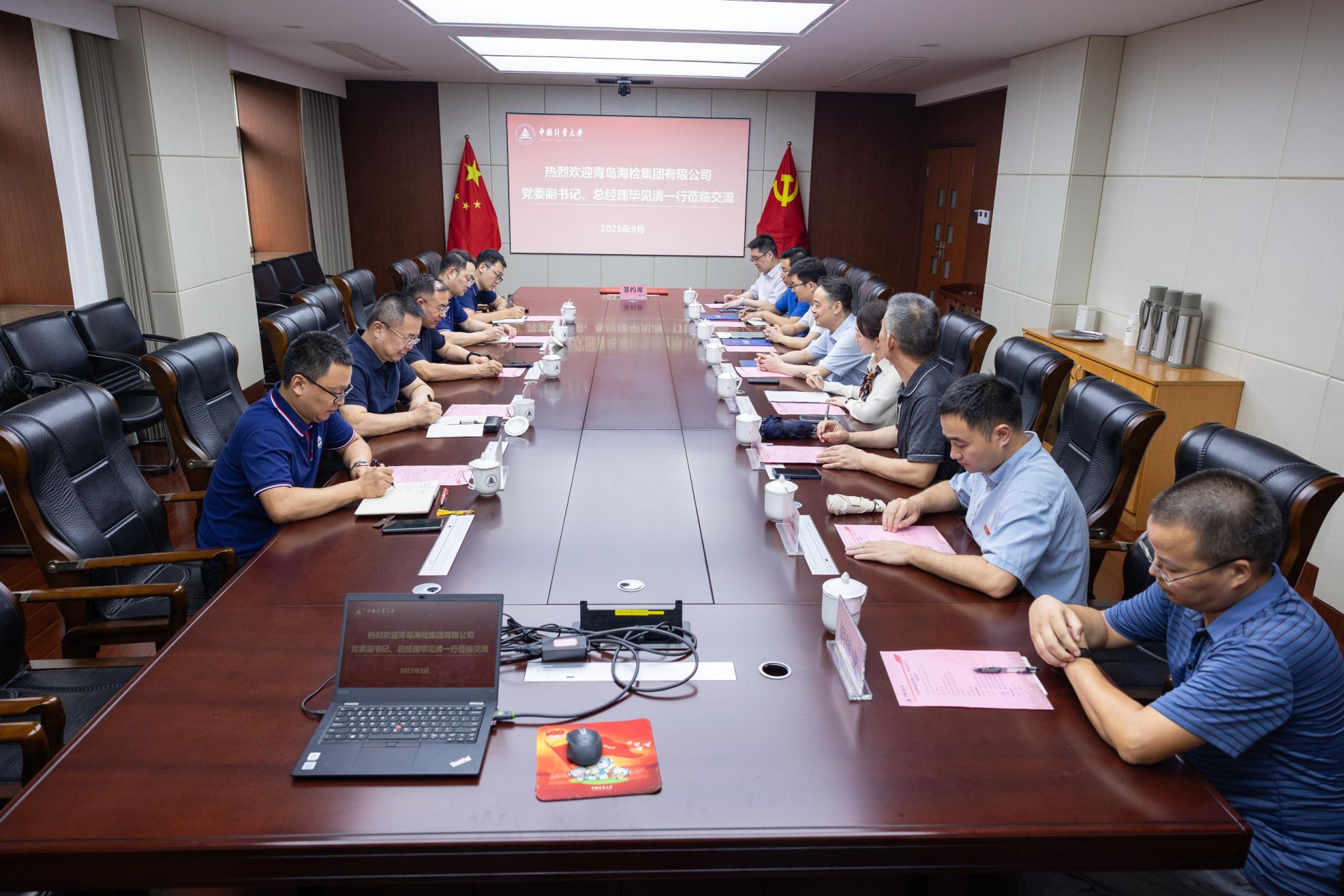 9月17日,青島海檢集團有限公司黨委副書記、總經理畢見清一行來訪,校黨委書記徐江榮代表學校對畢見清一行的到來表示熱烈歡迎。雙方在明德南樓313會議室舉行戰略合作協議簽約儀式。徐江榮出席,辦公室、對外聯絡處、計量測試與儀器學院等單位負責人和教育部原位計量重點實驗室主任等參加儀式,儀式由副校長王樂主持。