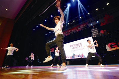 演奏完畢,臺下的觀眾還沉浸在美妙的旋律中,一群活力四射的男生女生又奔向舞臺。勁爆的音樂響起,一個個精靈開始旋轉(zhuǎn)、跳躍……