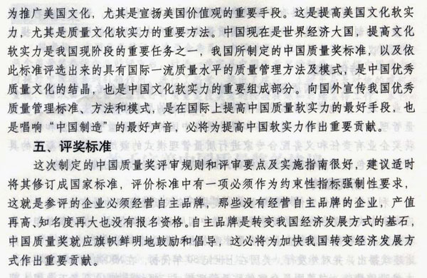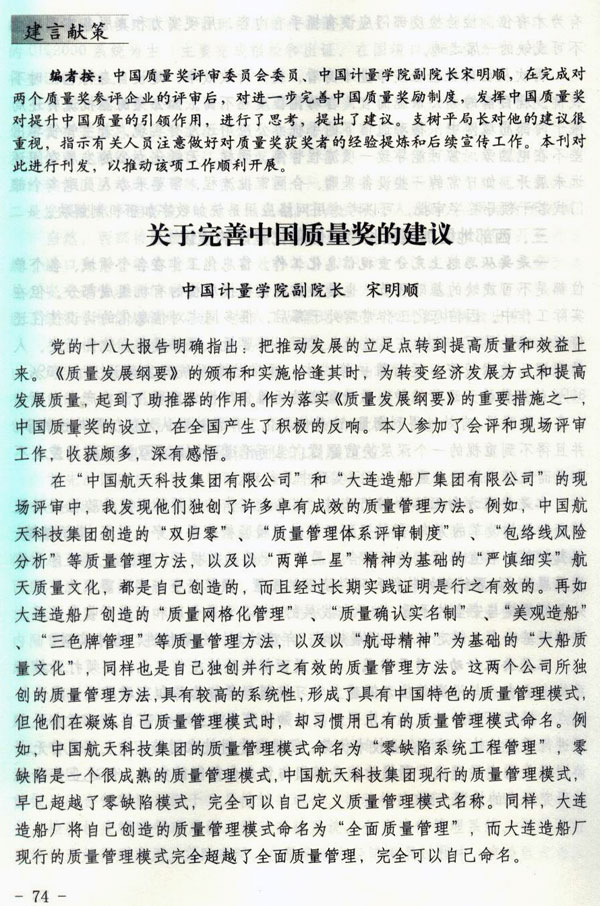 編者專門就該篇文章作了評論:中國質量獎評審委員會委員、中國計量學院副院長宋明順,在完成對兩個質獎參評企業的評審后,對進一步完善中國質量獎勵制度,發揮中國質量獎對提升中國質量的引領作用,進行了思考,提出了建議。支樹平局長對他的建議很重視,并指示有關人員注意做好對質量獎獲獎者的經驗提煉和后續宣傳工作。