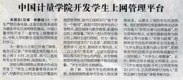 11月6日,《浙江教育報》發表《中國計量學院開發學生上網管理平臺》一文,報道我校根據不同年級學生的心智特點、成長規律與教學需要,配置相應上網個性化套餐,培養學生文明上網習慣的創新舉措。