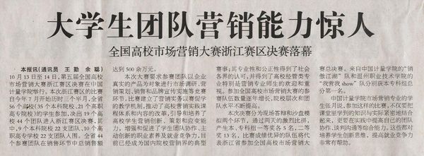 10月16日,《浙江教育報》發表《大學生團隊營銷能力驚人》的主題文章,介紹全國高校市場營銷大賽浙江賽區在我校舉辦的情況。