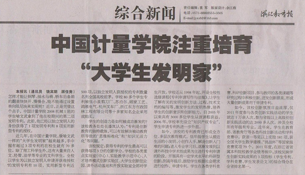 5月10日,《浙江教育報》在二版頭條發表題為《中國計量學院注重培育“大學生發明家”》的文章,報道我校開展專利創新教育教學成效。