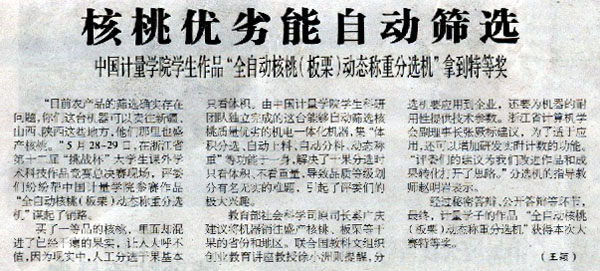 6月2日,《浙江科技報》發表題為《核桃優劣能自動篩選  中國計量學院學生作品“全自動核桃(板栗)動態稱重分選機”拿到特等獎》的文章,報道了我校學生作品在省挑戰杯大賽中獲得特等獎的情況。