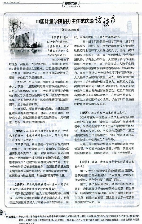 《求學》雜志2011年第五期刊登了《中國計量學院招辦主任訪談錄》