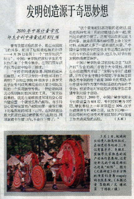 5月5日,《浙江科技報》發表了題為《發明創造源于奇思妙想》的文章,報道了我校鼓勵學生開展發明創造,培養學生創新精神的舉措及我校學生開展專利申請的成果。