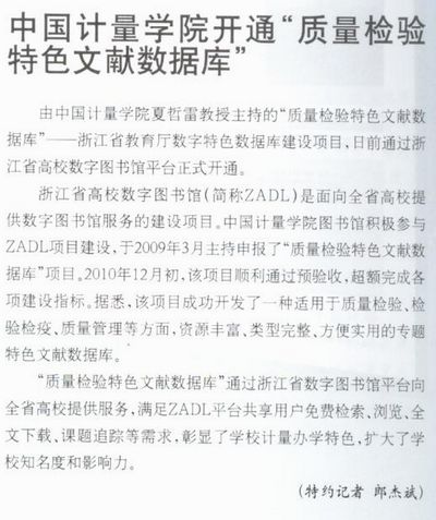 2011年3月,《教育與職業》雜志在“院校傳真”欄目發表相關文章,報道我校開通“質量檢驗特色文獻數據庫”的情況。