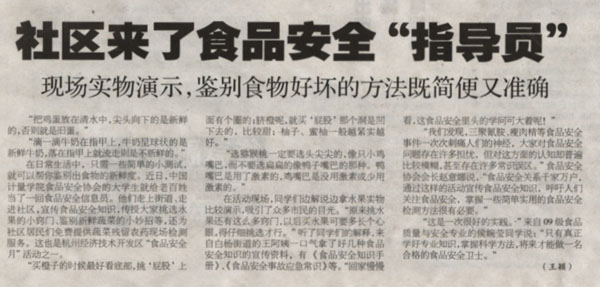3月24日,《浙江科技報》發表了題為《社區來了食品安全“指導員”》的文章,報道我校學生走進社區,開展食品安全知識宣傳活動的情況。