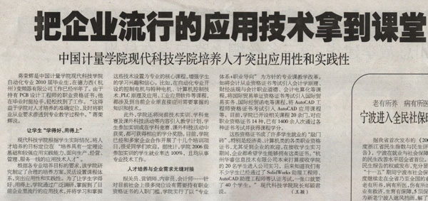 1月18日,《浙江科技報》發表了題為《把企業流行的應用技術拿到課堂  中國計量學院現代科技學院積極培養人才突出應用性和實踐性》的文章,報道了我校現代科技學院根據學生實際情況,緊緊握住人才培養的風向標,積極創新人才培養模式,培養應用型技術人才的情況。