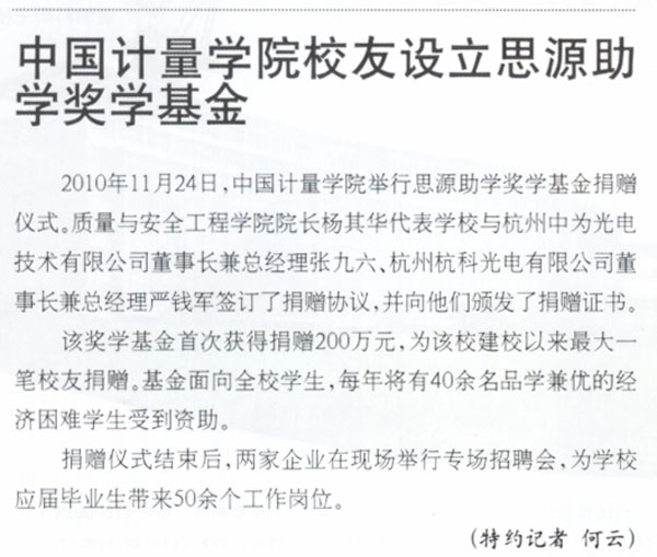 2011年1月,《教育與職業(yè)》在第1期雜志上發(fā)表了題為《中國計量學(xué)院校友設(shè)立思源助學(xué)獎學(xué)基金》的文章,報道了我校校友成功創(chuàng)業(yè),回饋母校,設(shè)立助學(xué)獎學(xué)基金的事跡。