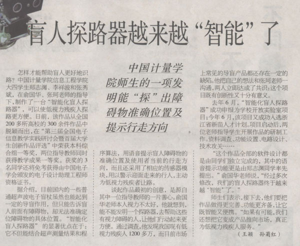 12月2日,《浙江科技報(bào)》發(fā)表了題為《盲人探路器越來越“智能”了》的文章,報(bào)道介紹了我校師生的科技創(chuàng)新作品。