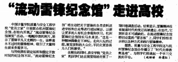 7月2日,《浙江科技報》發(fā)表題為《“流動雷鋒紀念館”走進高校》的文章,報道我校質(zhì)量安全與工程學院“黨員之家”聯(lián)合杭州雷鋒紀念館,在校園開展“流動雷鋒紀念館”展覽的情況。