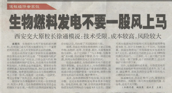 6月1日,《浙江科技報》在頭版發表了題為《生物燃料發電不要一股風上馬 西安交大原校長徐通模說:技術受限,成本校高,風險較大》的文章,報道了在我校舉行的節能減排與機爐技術難題研討會上的專家觀點。