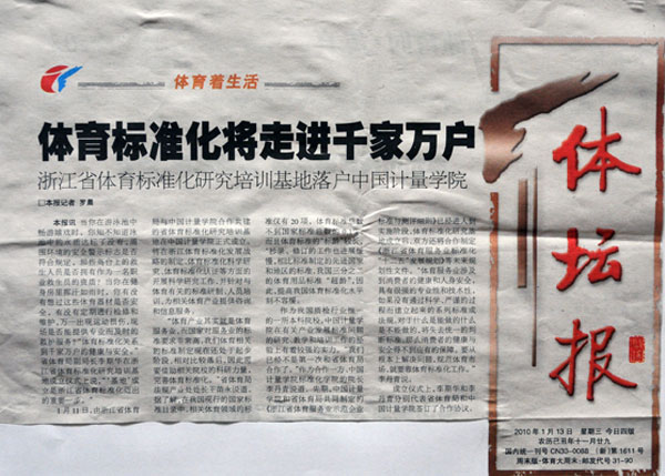 1月13日,《體壇報》在頭版頭條發表了題為《體育標準化將走進千家萬戶 浙江省體育標準化研究培訓基地落戶中國計量學院》的文章,詳細報道了省體育標準化培訓與研究基地成立的情況。