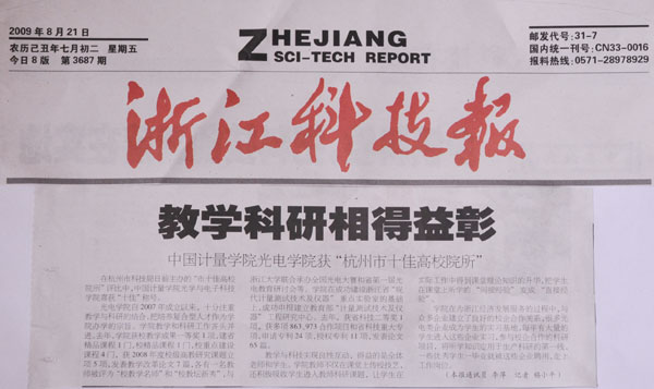 8月21日,《浙江科技報(bào)》以《教學(xué)科研相得益彰》為題,報(bào)道了我校光學(xué)與電子科技學(xué)院獲得“杭州市十佳高校院所”稱(chēng)號(hào)的情況,并介紹了學(xué)院在教學(xué)、科研、人才培養(yǎng)等方面的成果。