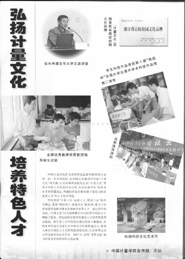 2008年第2期《高校思想政治工作》在封三以《弘揚計量文化 培養(yǎng)特色人才》為主題,圖文并茂地介紹了我校“計量文化”這一校園文化品牌。