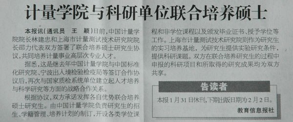 1月29日的《教育信息報(bào)》在頭版發(fā)表了題為《計(jì)量學(xué)院與科研單位聯(lián)合培養(yǎng)碩士》的文章,報(bào)道我校與上海市計(jì)量測試技術(shù)研究院合作培養(yǎng)碩士研究生的情況。這是我校繼去年與中國標(biāo)準(zhǔn)化研究院、寧波出入境檢驗(yàn)檢疫局等單位簽訂合作協(xié)議后,我校再一次與國家質(zhì)檢系統(tǒng)單位建立起人才培養(yǎng)與科學(xué)研究等方面的戰(zhàn)略合作關(guān)系。
