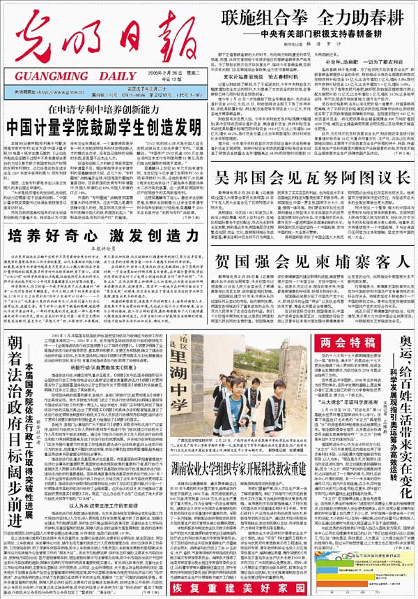 2月26日,《光明日報》在頭版頭條的重要位置刊發了題為《中國計量學院鼓勵學生創造發明》的文章,全面而深入地報道了我校通過鼓勵學生申請專利培養學生創新能力,為建設創新型國家,培養大批創新型人才所做的有益嘗試和有效探索,及取得的成績。同時,還在頭版配發了題為《培養好奇心 激發創造力》的評論文章,對我校鼓勵學生創造發明,培養學生創新能力的做法及其重要意義作了深刻的評述。當天的中央電視臺新聞頻道也在《朝聞天下》欄目中播報了《光明日報》刊發文章報道我校以鼓勵學生申請專利培養學生創新精神和創新能力的新聞。這是我校對外宣傳工作的一項重要成果和一次重大突破,對宣傳學校良好的社會形象,擴大學校的知名度和影響力產生了積極的影響。