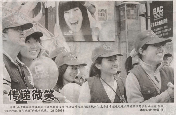 我校志愿者們一張張洋溢著青春的活力與熱情的笑臉在攝影記者的鏡頭下被定格。4月21日,《今日早報》上一幅《傳遞微笑》的圖片,記錄下了我校青年志愿者們在“生活品質之城?微笑杭州”大型公益活動中燦爛的笑容,充滿展現了我校學子朝氣蓬勃、熱心公益事業的風采。