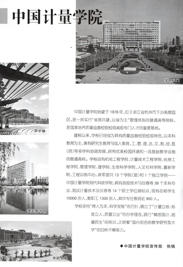 由浙江教育報刊總社出版的《中學生天地》在最新一期2007年第5期雜志的封二位置圖文并茂地介紹了中國計量學院的辦學情況,展示了學校優良的辦學環境和辦學條件。   《中學生天地》為中國期刊方陣雙百期刊,該期雜志又為“高中學習版”,在高考開始的前夕刊登我校的情況介紹,起到了廣泛而良好的宣傳作用與效果。
