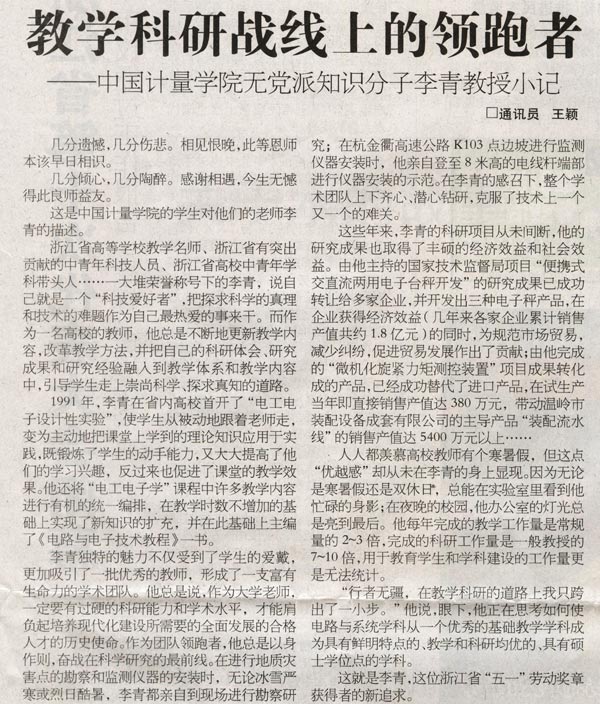 5月12日,由浙江省政協(xié)主辦的《聯(lián)誼報(bào)》在第二版發(fā)表了題為《教學(xué)科研戰(zhàn)線上的領(lǐng)跑者》一文,詳細(xì)介紹和報(bào)道了浙江省“五一”勞動(dòng)獎(jiǎng)?wù)芦@得者、我校無(wú)黨派知識(shí)分子李青教授的先進(jìn)事跡。