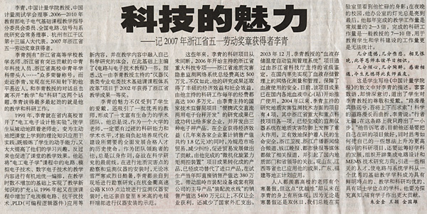 5月16日,《浙江工人日報》在第二版“勞模風(fēng)采”欄目發(fā)表了題為《科技的魅力》一文,詳細(xì)介紹和報道了浙江省“五一”勞動獎?wù)芦@得者、我校李青教授的先進事跡。
