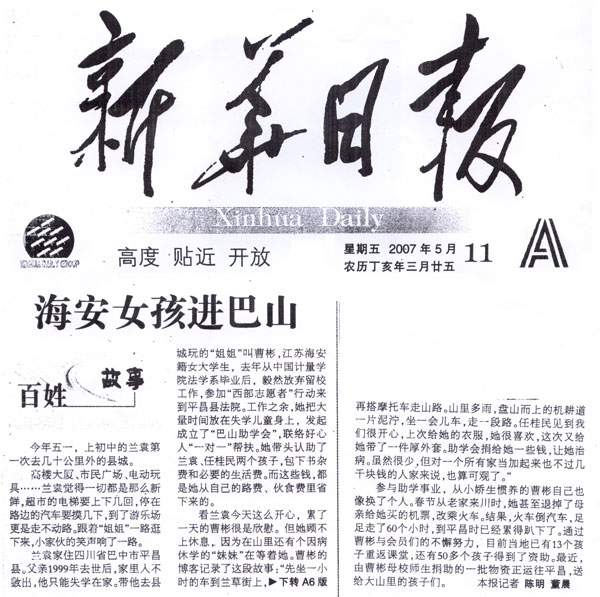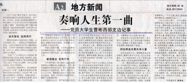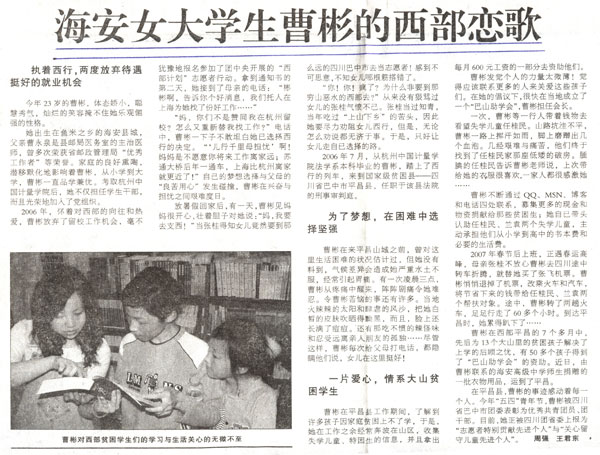 服務西部和省內欠發達地區計劃開展幾年以來,我校層層發動,同學積極響應,每年都有一大批品學兼優的志愿者分赴服務地,開展以基層法律授助、義務支教、行政管理、遠程教育等為內容的志愿服務。在服務期間,我校志愿者克服水土不服、語言不通、環境陌生等困難,以積極的心態投入工作,開展了各具特色的服務,為當地建設貢獻了自己的力量,也充分展現出我校大學生良好的精神風采和高尚的道德品質。我校志愿者的出色表現,引起了有關媒體的廣泛關注,其中曹彬同學的事跡就被《新華日報》等多家媒體進行報道。   2006年,志愿者曹彬同學響應團中央號召,赴四川省平昌縣人民法院進行為期一年的志愿服務,服務期間,曹彬同學協助法院審理刑事案件154件,發表學術論文調研9篇,參與評建四川省優秀青少年維權崗,參加院志的編纂工作,開展院級機關普通話培訓,并兼任了平昌縣金龍小學法制輔導員。   工作之余,曹彬同學聯合在巴中地區服務的志愿者創辦了四川省第二個民間助學機構“巴山助學會”,并擔任會長,半年多來籌款2萬元衣物文具若干,資助貧困學生20余人,巴山里的孩子們帶著美麗的野百合,自家腌制的臘肉,從幾十里外的山村里走幾個小時的山路送到“愛心姐姐”的門前。在助學會中,曹彬同學自己也利用節省下來的路費和生活費資助了兩名面臨失學的初三學生,承諾一直資助到他們上完高中。   作為西部計劃平昌服務團團長,曹彬同學關心志愿者、積極參加省市縣團委舉辦活動,在志愿者中起到了模范帶頭作用,獲市委縣委的一致好評,2007年4月,被共青團巴中市委員會表彰為“巴中市2007年度優秀團員”,同時當選為中國共青團巴中市第二次代表大會唯一的志愿者代表。   曹彬同學出色的工作也受到了媒體的關注,一年來,她的優秀事跡屢屢見報。《新華日報》、《巴中日報》、《南通日報》、《江蘇工人報》《江蘇海安新聞》分別進行了題為《曹彬,唱響青春之歌》、《一個貧困生的快樂“五一”》、《奏響人生第一曲—黨員大學生曹彬西部支邊紀事》、《海安女孩進巴山》、《海安女大學生曹彬的西部戀歌》、《青春在巴蜀山區綻放—黨員大學生曹彬西部支邊紀事》的報道。此外,曹彬同學還走進了江蘇省海安縣人民廣播電臺《說說聽聽》的直播現場,并接受了江蘇省南通電視臺《新聞大不同》(情感地帶)欄目組的專訪,錄制專題片《讓夢飛翔》。