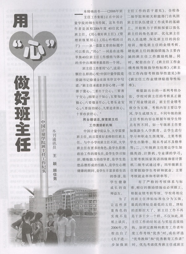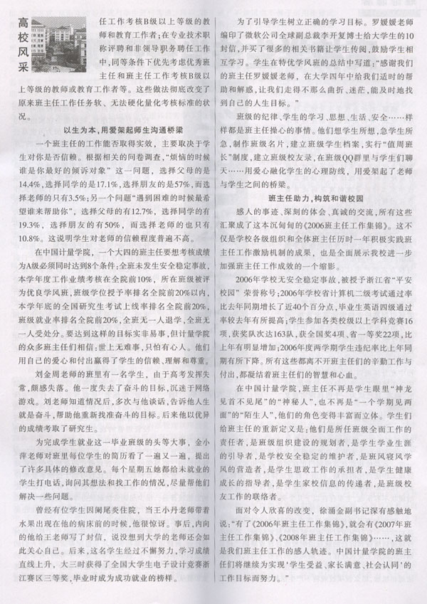 2007年第四期《高校思想政治工作》在“高校風采”欄目中發表了題為《用“心”做好班主任——中國計量學院班主任工作紀實》一文,報道了我校班主任工作的改革與創新情況。