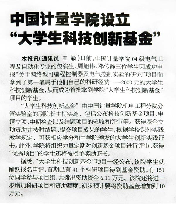 在11月25日的《教育信息報》上發表了題為《中國計量學院設立“大學生科技創新基金”》一文,報道了我校大學生科技創新基金的情況。