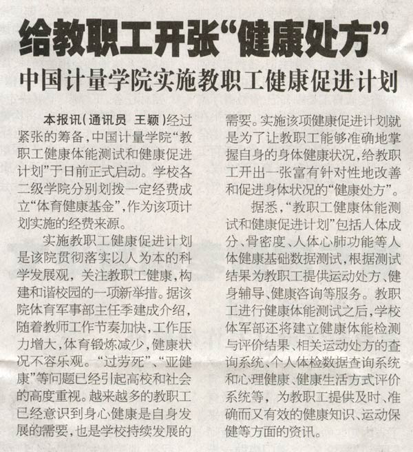 《教育信息報(bào)》刊登題為“給教職工開張‘健康處方’”的文章介紹我校實(shí)施教職工健康促進(jìn)計(jì)劃的情況。