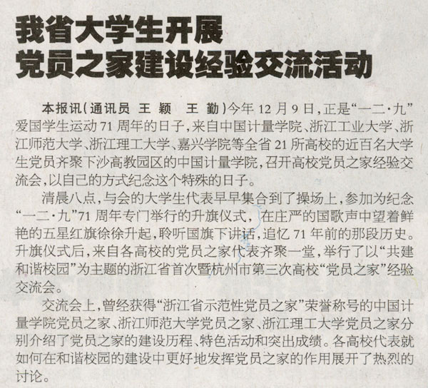 《教育信息報(bào)》刊登題為“我省大學(xué)生開展黨員之家建設(shè)經(jīng)驗(yàn)交流活動(dòng)”的文章介紹我校黨員之家建設(shè)經(jīng)驗(yàn)交流活動(dòng)的情況。