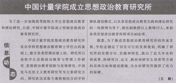 2007年第1期的《高校思想政治工作》上發表了題為《中國計量學院成立思想政治教育研究所》一文,全面報道了我校成立思想政治教育研究所的相關情況。